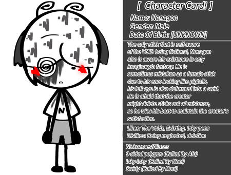 sometimes mistaken as a female stick due to his ears looking like pigtails, his left eye is also deformed into a swirl. He is afraid that the creator might delete sticks out of existence, so he tries his best to maintain the creator's