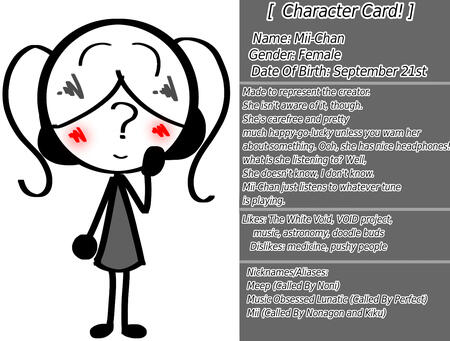 Date Of Birth: September 21stMade to represent the creator. She isn't aware of it, though. She's carefree and prettymuch happy-go-lucky unless you warn her about something. Ooh, she has nice headphones! what is she listening to? Well, She doesn't know, I don't know. Mii-Chan just listens to whatever tune is playing.Likes: The White Void, VOID project, music, astronomy, doodle buds