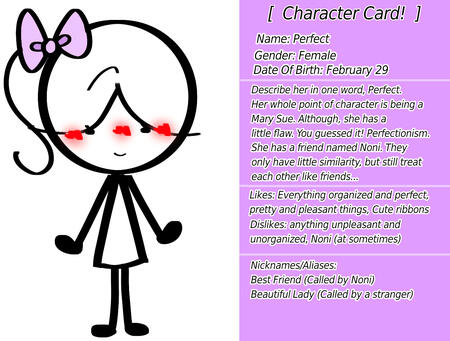 a friendly stick. She has a friend named Perfect.Likes: Kittens, Yay-Town, her friend Perfect