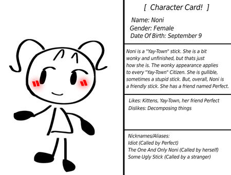 Noni has a Character Card for herself.Noni is a "Yay-Town" stick. She is a bit wonky and unfinished, but thats just how she is. The wonky appearance applies