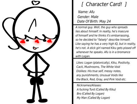 Date Of Birth: May 24thA normal guy. Well, the guy who spreads lies about himself. In reality, he's insecure of himself and he thinks it's embarrassing, so he decided to "falsely" describe himself. Like saying he has a very high IQ, but in reality, he's not. A stick girl named Kiku gets pissed off whenever he speaks. Afu is in a bromance with Logan.Likes: Logan (platonically), Kiku, Positivity,